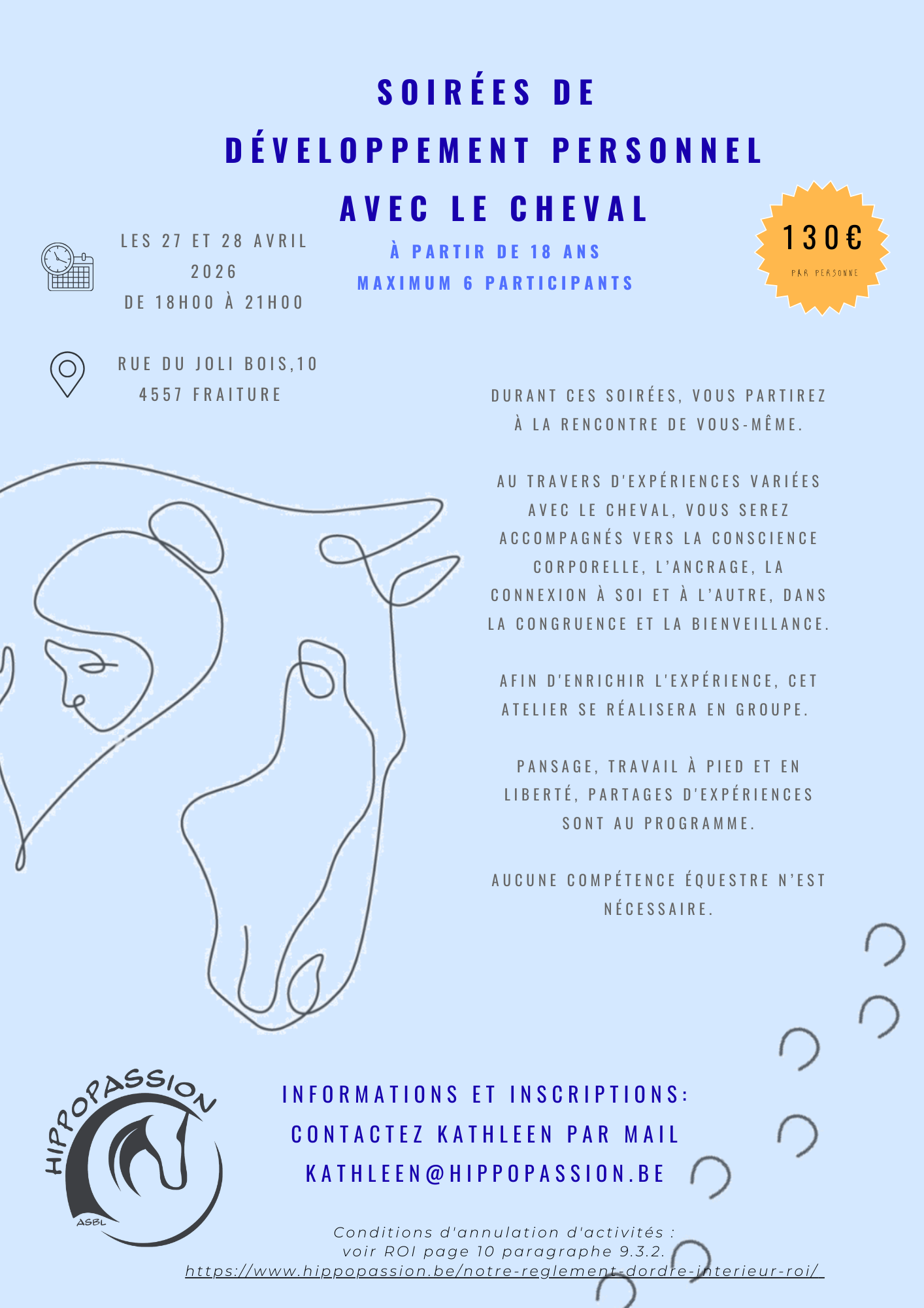 Soirées de développement personnel les 27 et 28 avril / Activités / Par Info Hippopassion Kathleen vous propose deux soirées de développement personnel les 27 et 28 avril! Les inscriptions se font par mail via l’adresse kathleen@hippopassion.be