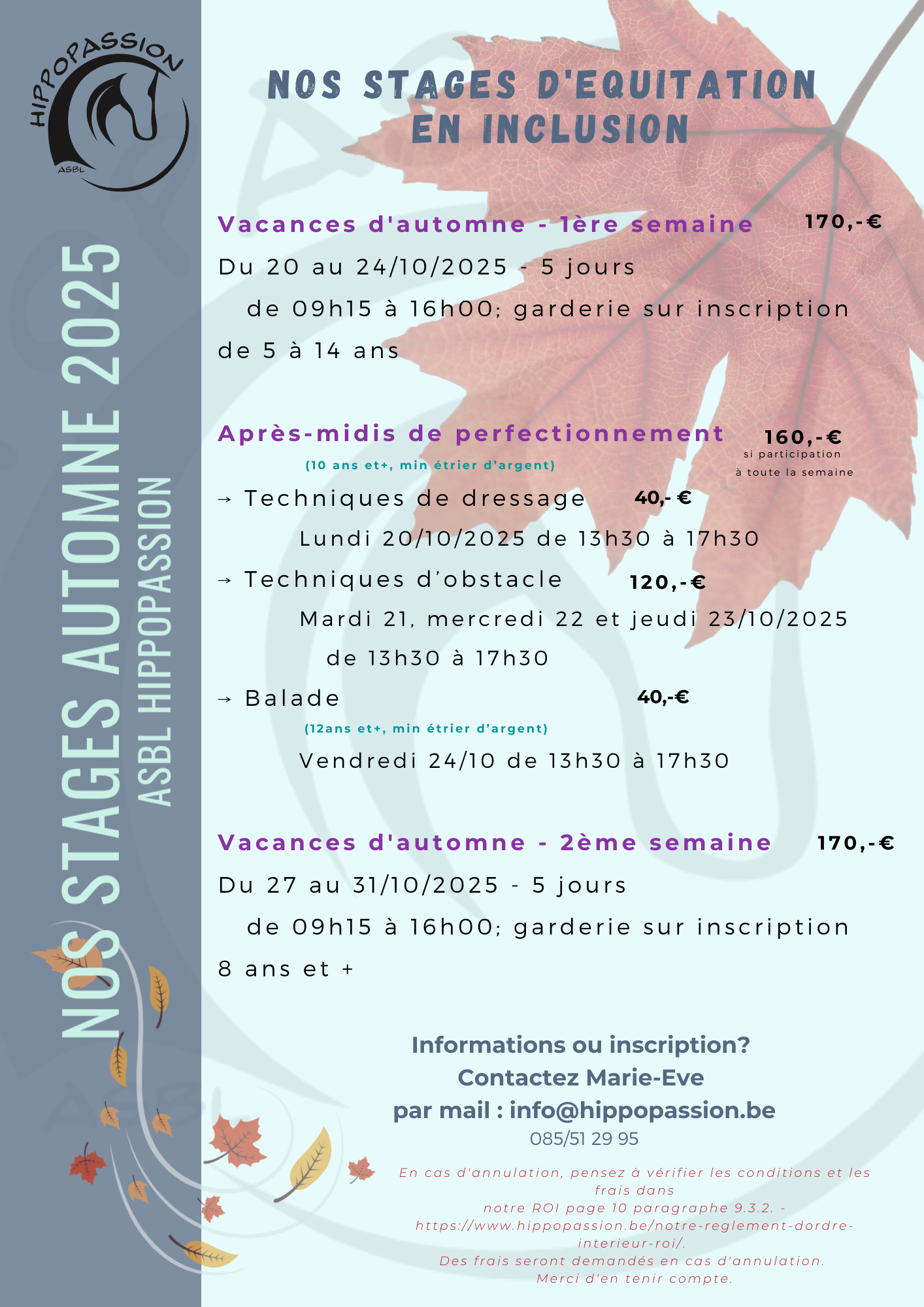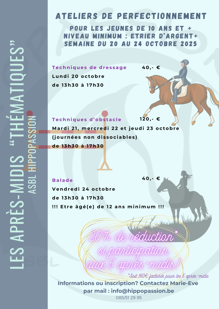 Les inscriptions aux stages et garderies se font par mail auprès de Marie-Eve à l’adresse info@hippopassion.be